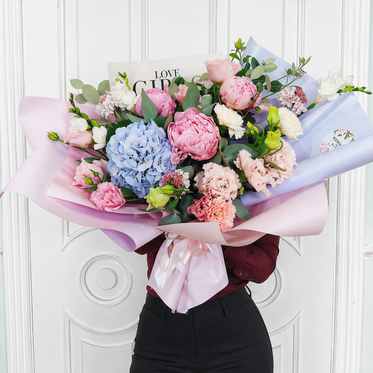 Купить букет из 7 розовых пионов с лизиантусом и рускусом можно с доставкой и самовывозом.